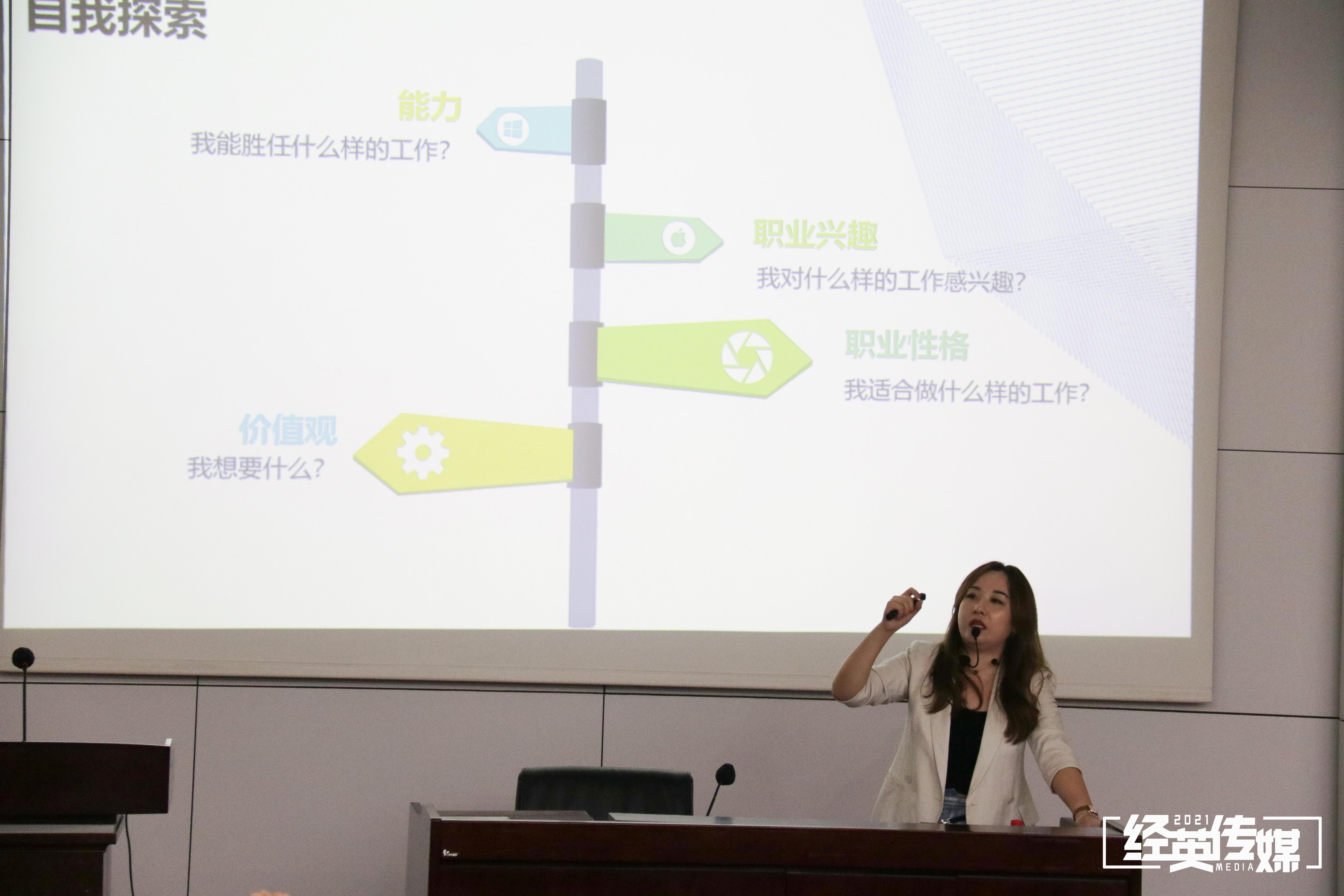 另外,任老师向同学们解释了职业生涯规划的意义,归结为:方向不对,努力白费。她根据现场同学不同的选择方向,从考研、就业、考公务员和出国留学四个大方向为同学们带来讲解,建议同学们能在学习生活中不断探索,逐渐明确自己的努力方向。任老师还为同学们讲解了职业规划全流程,她指出,同学们要从自我探索出发,深刻认识自己的能力、职业兴趣、职业性格以及价值观;同时也到外部世界探索,关注当今社会对商科学子的要求。争取形成一个由决策、行动、评估,以及再次自我探索的良性循环。